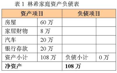 林希今年32歲,2000年碩士畢業,現在一家外企任高級經理,年薪20萬元,年終獎五萬元。林太太今年30歲,醫學本科畢業,現經營一家小型美容院,生意雖不大,但擁有一批忠實的客戶,年收入15萬元。2003年,林希夫婦按揭購置了一套97平方米的房子,去年已繳清所有房貸,該房產現市值60萬元。今年年初,又買了一輛20萬元的車,尚余20萬元銀行存款。