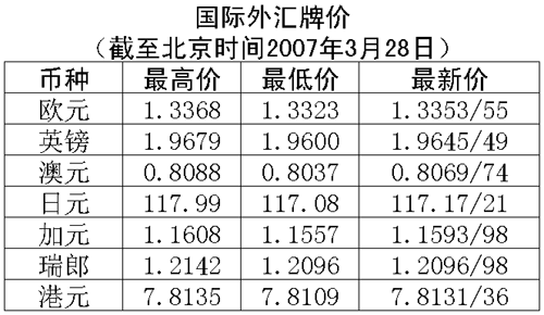 根據中國人民銀行授權中國外匯交易中心發布的公告,2007年3月28日銀行間外匯市場美元等交易貨幣對人民幣匯率的中間價為:1美元兌人民幣7.7318元,1歐元兌人民幣10.3256元,100日元兌人民幣6.5602元,1港幣兌人民幣0.98972元,1英鎊兌人民幣15.2021元。