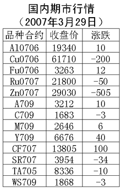 3月29日國內期貨市場鋁、燃油、豆類價格上漲,其余品種下跌。滬銅706合約周四下跌200元/噸,收盤61710元/噸,支撐價位61000元一線,上漲壓力65000元一線。滬鋁706合約周四上漲10元/噸,收盤19340元/噸,支撐19200元一線,上漲壓力19800元一線。