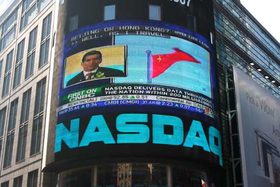 4月3日,美國紐約時報廣場的納斯達克大型電視屏幕直播開市盛況和有關中國的畫面。當日紐約時間上午九點半(北京時間當晚九點半),該交易所在中國北京人民大會堂“遙控”舉行開市儀式,以慶祝越來越多的中國公司在該交易所掛牌上市。