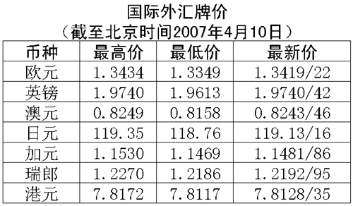 根據中國人民銀行授權中國外匯交易中心發布的公告,2007年4月10日銀行間外匯市場美元等交易貨幣對人民幣匯率的中間價為:1美元兌人民幣7.7304元,1歐元兌人民幣10.3340元,100日元兌人民幣6.4877元,1港幣兌人民幣0.98893元,1英鎊兌人民幣15.1821元。