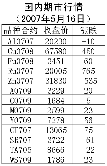 東京橡膠周三上漲10日元/公斤,收盤283.8日元/公斤。滬膠707合約周三上漲765元/噸,收盤20005元/噸,達(dá)到漲停板明日漲跌幅度擴(kuò)大到6%。美原油周二上漲0.53美元/桶,收盤63.08美元/桶。滬燃油707合約周三上漲85元/噸,收盤3477元/噸,支撐價位3400元一線,上漲壓力3500元一線。