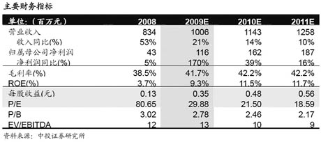 元,按照轉增后總股本(10轉增3)攤薄每股收益0.05元。對比公司2008和2009年的1季度財報,差異較大的會計科目在于三費,2009年1季度公司銷售費用和管理費用同比分別增長484.06%和87.02%,達到1789萬元和2520萬元。財務費用同比增長157.33%達到1140萬元。該三項費用合計同比增加3352萬元,使凈利潤同比減少約3000萬元,造成2009年1季度公司收入穩步增長而凈利潤同比大幅下降。 值得肯定的一點是,2009年一季度凈利潤基本上都是由主營業務貢獻,在不發生2008年4季度大規模非經常性損失的前提下,有線網絡業務的穩定性特點是公司未來收入和盈利的保障。公司計劃2009年實現營業收入9億元、凈利潤7000萬元,1季度已經完成收入和凈利潤指標的24.69%和32.41%。 國泰君安研究所表示,如果以1季度業績為藍本預測,則公司全年業績很有可能超預算。但鑒于公司連續兩年低于預期的歷史,仍然維持2009-2011年全面攤薄每股收益分別為0.17元、0.21元、0.25元的盈利預測。對應當前股價的市盈率分別為53.6倍、44.2倍、36.3倍,對應除權后股價對應市盈率分別為41.3倍、34
