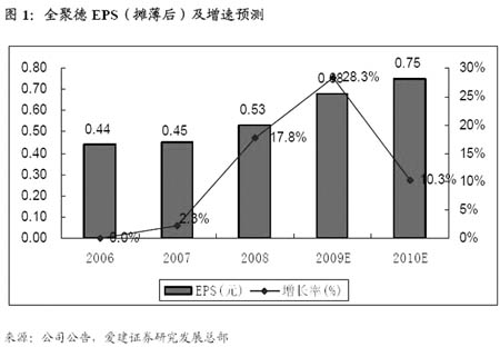 根據愛建證券的判斷,綜合信息來看,隨著成本降低及重點店盈利良好,2009年全聚德的全年凈利潤有望比去年增長28%左右。預計全聚德2009年到2010年的每股收益將分別為0.68元和0.75元,對應當前股價2009、2010年PE為40.5倍和36.7倍,大大高于目前A股的平均市盈率。我們首次給予全聚德“中性”評級。對于中長線投資者而言,目前需要的是耐心,安靜地等待這家百年老店長期買點出現。