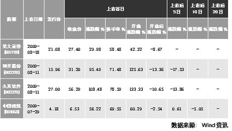 雖然新股發行接連不斷,但投資者今時在炒新的時候卻多了一份謹慎,因為回頭看今年已上市的新股,帶給“炒新一族”的大多是被套紀錄。例如,桂林三金、萬馬電纜、家潤多、久其軟件、神開股份5只新股發行市盈率高達30多倍,上市首日收盤漲幅卻只有1倍左右,而且這些新股在上市首日即創出“頭部”,隨后一路走低。