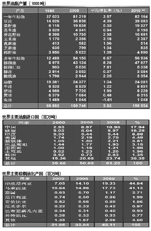 目前世界棕櫚油最大出口國———馬來西亞棕櫚油總署(MPOB)經濟與產業拓展總監FaizahMohdShariff博士日前在“第四屆國際油脂油料大會”上預測,2010年,印度尼西亞將超越馬來西亞成為東南亞地區第一大棕櫚油出口國,印度尼西亞和馬來西亞將保持東南亞第一和第二大棕櫚油出產國的地位直至2015年。東亞地區國家人口高速增長是推動棕櫚油產品需求增長的主要因素,東亞地區將繼續成為世界上重要的棕櫚油市場(具體歷史數據見下表)。