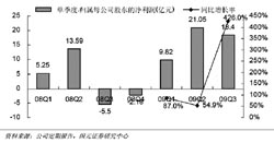 單季度歸屬于母公司的凈利潤變化及同比增速(2008.Q1-2009.Q3)