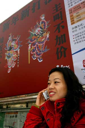 2月8日,一位女青年在北京街頭使用移動電話。當日,北京移動推出全球通“暢聽99”的業(yè)務(wù)套餐,加入該套餐業(yè)務(wù)的手機用戶可以享受到被叫完全免費,本地主叫最低費用為0.15元/分鐘的服務(wù)。