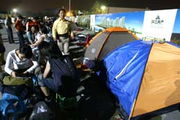 近日,杭州某樓盤出現多年不見的通宵排隊買房的景象。許多購房者住帳篷、睡草席,連排三天的隊。圖為5月27日,購房者在售樓處外排隊等待開盤。