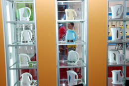 2007中國(guó)日用小家電博覽會(huì)日前在浙江余姚舉行,吸引來自長(zhǎng)三角、珠三角、環(huán)渤海灣三大小家電產(chǎn)業(yè)集聚區(qū)的300多家企業(yè)參展,參展產(chǎn)品近萬種。圖為一公司展區(qū)擺滿了各種款式的電熱水壺。