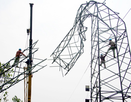 江蘇省泰州市高港區(qū)日前遭遇龍卷風襲擊,造成4座110千伏高壓供電鐵塔損毀,1200多戶村民家中斷電,寧(南京)通(南通)高速公路高港段封路兩個小時。圖為電力施工人員搶修被龍卷風損毀的高壓供電鐵塔。