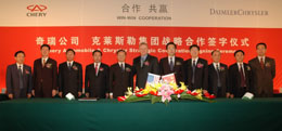 奇瑞汽車與克萊斯勒戰略合作簽字儀式在北京釣魚臺舉行。(本報資料照片) | 目前,關于“自主創新”與“合資”是否悖行矛盾的討論仍不絕于耳。最近,商務部副部長、國家機電產品進出口辦公室主任魏建國指出,“在經濟全球化的今天,任何一個國家都不可能獨自完成汽車產業鏈而具有競爭優勢,必須在開放的環境中加強合作,實現互利共贏。” 近期,由于中國自主品牌汽車與外資合作的新聞連續發布,奇瑞、哈飛、長豐、吉利等紛紛加快與外資合作步伐。有業內人士稱,這是中國汽車業的第二次合資合作浪潮。值得稱道的是,雙方合作已不再是20年來“市場換技術”的單一合資框架模式,中國汽車企業在合作談判中開始握有更多的話語權。而“自主創新”正成為全新汽車合作時代的最大看點。 我們通過對以下三家自主品牌汽車企業在與外資的創新合作模式的分析中看出,三家企業都無一例外的“捍衛”了品牌的自主權,而更讓我們看到的是,國際汽車巨頭們也已認識到了這一點,他們也再不斷調整中國市場戰略布局并作出讓步。