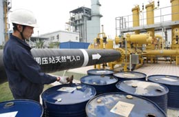 位于河南鄭州高新技術產業開發區的鄭州燃氣電站,是一個以天然氣為能源的發電站,2007年1月建成并網發電。截至9月30日,該電站累計發電7.5584億千瓦時,不僅成為華中電網的重要電源支撐點,提高了調峰能力,也使河南省的電源結構和中心城市的環境質量得到改善。圖為一名工人在鄭州燃氣電站的天然氣調壓站內回收天然氣體中殘留的油品。