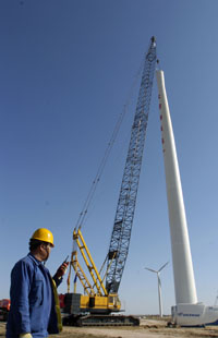 據中國風能協會公布的數據,截至2006年底,我國已建成91個風力發電場,總裝機容量2599兆瓦。據了解,預計到2010年底,我國發電總裝機容量將達到5000兆瓦,電力行業的高速發展將帶動風電產業步入快車道。圖為寧夏發電集團太陽山風力發電場工程建設者正在指揮施工。