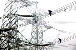 位于重慶市綦江縣的隆盛變電站目前已基本建成,本月底即將投入運行,這標志著重慶提前三年完成了500千伏“日”字形環網建設,重慶電力供應緊張局面將得到緩解。圖為電業工人在高空作業。