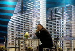 近日舉行的杭州不動產交易會上冷冷清清。圖為一位來逛杭州不動產交易會的市民在樓盤廣告前小憩。本報記者:王定昶 攝 |