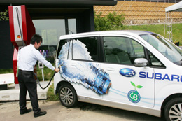 日本在八國峰會上展示電動及電燃混合動力汽車。7月8日,工作人員為一輛電動車充電。這種像加油機的充電器15分鐘可完成一輛電動車的充電。電動車一次充電可行駛80公里。可以預測在油價不斷高漲的情勢下,各國都在通過征收燃油稅等政策措施和加快研制電燃混合動力汽車等技術手段,推動節能進程。新華社記者:王成云