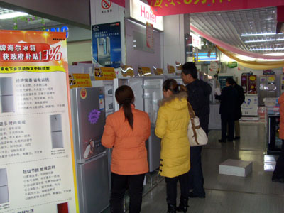 日前,第一批“最省電冰箱”——日耗電0.33度的海爾節能冰箱正式走進農村市場。這是國家實施“家電下鄉”政策以來,冰箱行業推出的最具節能品質的產品。作為冰箱行業最具責任感的企業之一,海爾冰箱在前期的“家電下鄉”過程中,積極推進農村基礎調研,精心分析用戶需求,并推出了三天只用一度電的“最節能冰箱”。圖為消費者正在選購中標“家電下鄉”項目的海爾冰箱。