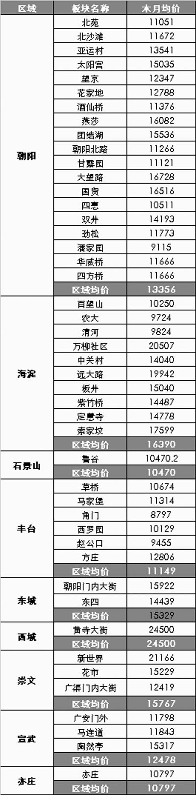 北京市各區(qū)域、板塊均價(jià)(單位:元/平方米)