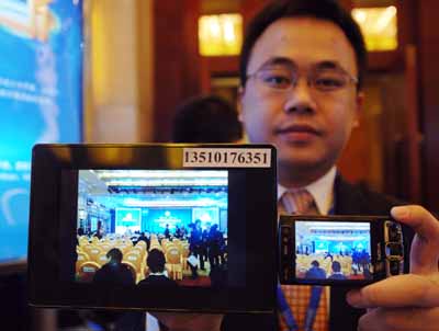 據了解,自2000年中國移動推出“移動夢網創業計劃”以來,重慶移動已分別在2002年和2004年舉辦兩屆移動夢網重慶論壇。圖為一名移動公司的技術人員正在展示可以通過電信新技術接收手機照片的電子相框。