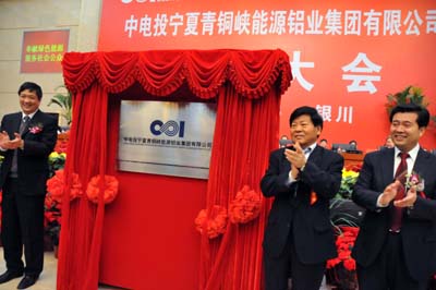 12月26日,注冊(cè)資本金50億元中電投寧夏青銅峽能源鋁業(yè)集團(tuán)有限公司正式成立。寧夏政府主席王正偉(右一)與中國電力投資集團(tuán)總經(jīng)理陸啟洲(左一)等領(lǐng)導(dǎo)一起為中電投寧夏青銅峽能源鋁業(yè)集團(tuán)有限公司揭牌。本報(bào)記者:武勇
