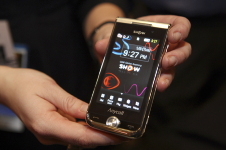 工作人員展示韓國三星公司開發的一款可作為投影儀使用的手機。