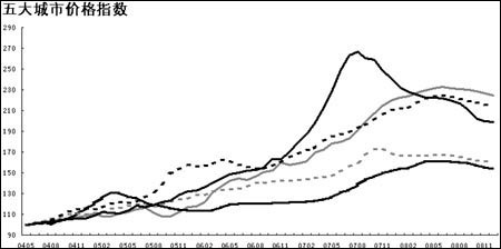 五大城市中原領(lǐng)先指數(shù)月度走勢圖(2004年5月-2008年12月)