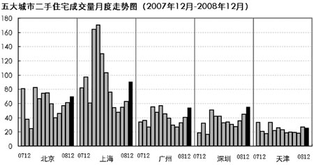 繼上月成交量小幅回升后,2008年12月五大城市二手住宅成交量仍保持了上升的態(tài)勢。得益于救市政策的頻繁出臺,原本淡季的12月份成交量不降反升,且是在前兩個月已經(jīng)連續(xù)上升的基礎(chǔ)上,表明救市政策的效果明顯。
