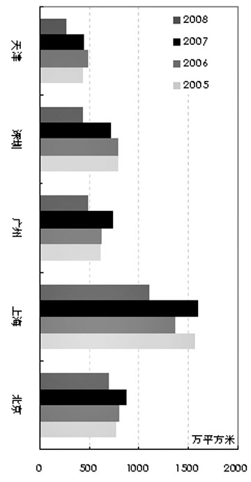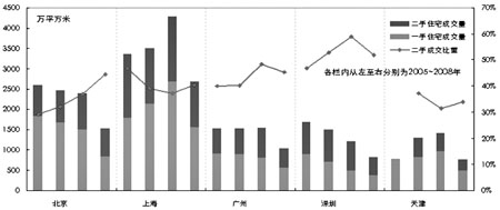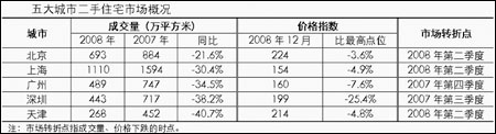 ●根據(jù)中原地產(chǎn)研究中心統(tǒng)計,2008年全年五大城市二手住宅總成交面積僅3003萬平方米,較2007年下降31.6%,也是最近四年來的最低水平,市場低迷可見一斑。 ●從區(qū)域來看,珠三角城市萎縮較為嚴重,廣州和深圳2008年二手住宅成交量分別同比下跌34.5%和38.2%。而全國其他主要區(qū)域二手住宅市場亦有不同程度回落。 ●在珠三角城市帶領(lǐng)下,北京、上海和天津的二手房價在2008年第二季度開始出現(xiàn)下滑。第四季度起,受宏觀經(jīng)濟和金融危機的影響,價格下調(diào)速度有所加快。
