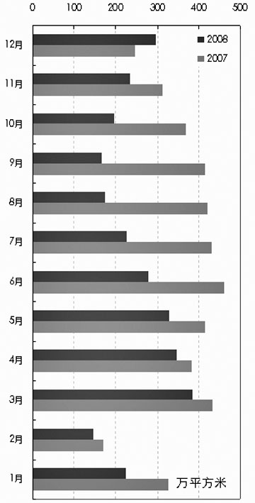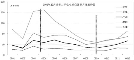●1月至3月,季節(jié)性影響下成交量小幅回升。五大城市二手住宅成交量在2008年春節(jié)后出現(xiàn)一波季節(jié)性的上升,其中上海月度成交量一度沖高至170萬平方米,接近2007年高峰時期的水平。 ●4月至9月,成交量大幅度下降。深圳、廣州的市場不景氣逐漸向北蔓延,開發(fā)商在新房市場的降價引發(fā)購房者觀望情緒。而地震、奧運、南方暴雨等也對區(qū)域市場造成了一定影響。隨后的金融危機更加重了市場的不景氣局面。各地二手成交量逐月下滑,至8、9月份下滑至最低水平,五城市月度總成交量僅170萬平方米,較2008年3月份下滑57%。 ●10月至12月,積壓剛性需求釋放,成交量強勁回升。救市政策的刺激和新房市場的持續(xù)降價帶動了四季度二手住宅成交量的回升。根據(jù)中原地產(chǎn)統(tǒng)計,2008年第四季度五大城市總成交量以每月21%左右的幅度逐漸回升。