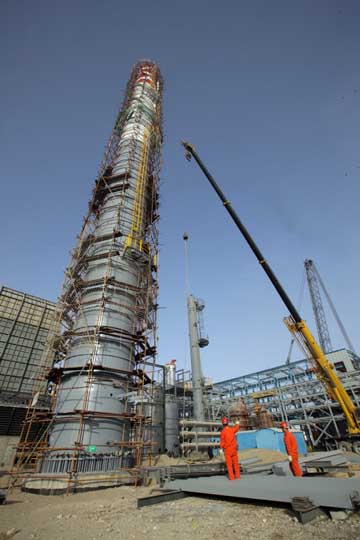 目前,設計年產80萬噸尿素的中石油塔里木油田化肥項目正在加緊施工,預計將于2009年10月投料試車。該項目的建成將提高塔里木油田石化產品的附加值,為新疆乃至全國的農業生產提供更堅實的生產資料保障。圖為塔里木油田員工在大化肥項目工地施工。