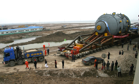 天津石化100萬噸乙烯及配套項(xiàng)目的超重設(shè)備EO反應(yīng)器,日前從天津臨港碼頭運(yùn)抵天津石化100萬噸乙烯項(xiàng)目工地。