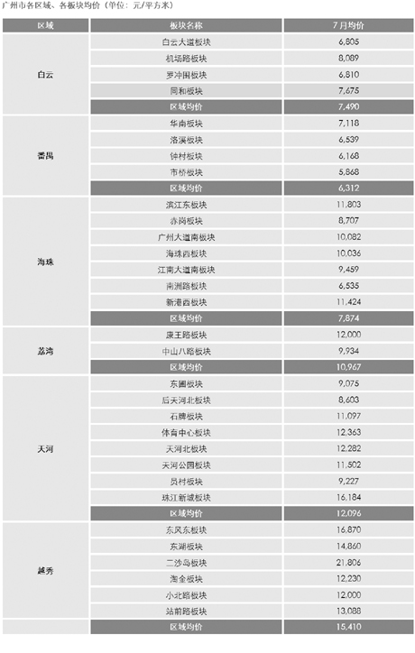 ■中原(廣州)領先指數(2009年7月) ●中原(廣州)領先指數為226點,樣本成交均價為10205元/平方米,環比升幅達2.8%,創有統計以來的最高記錄,較2007年10月的歷史高峰217點還要高出4%。 ●成交量環比開始小幅回調,但降幅不足一成。