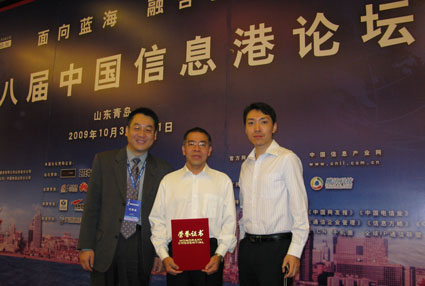 英泰利智總經理屠曉東(左)與廣東聯通高管羅兆廣(中)在獲獎現場