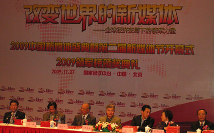 中國新媒體領軍榜”的評選活動,經過社會調查、組委會初評、參評單位提交資料審核、專家委員會評審等環節,華聲在線、人民網、新華網、央視網、百度、網易、騰訊、新浪、搜狐、鳳凰網等十家國內知名網站獲得了“2009中國(網絡)新媒體十大領軍品牌”殊榮,華聲在線董事長薛伯清、新浪CEO曹國偉、網易CEO丁磊、人民網總裁何加正、華視傳媒董事局主席兼首席執行官李利民、漢王科技董事長劉迎建、中文在線董事長兼總裁童之磊、央視網總裁汪文斌、優視動景CEO余永福、搜狐董事局主席兼CEO張朝陽等業界精英獲評“2009中國新媒體十大領軍人物”。