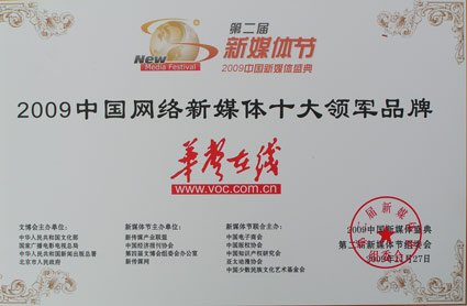 華聲在線榮獲“2009中國網絡新媒體十大領軍品牌”獲獎證書