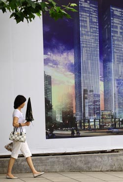 7月11日,一位女士從市中心的一處樓盤促銷廣告牌前經過!∵M入6月,大連樓市多個樓盤出現“個位數成交”,部分地產項目陸續推出了全款打折優惠。新華社記者