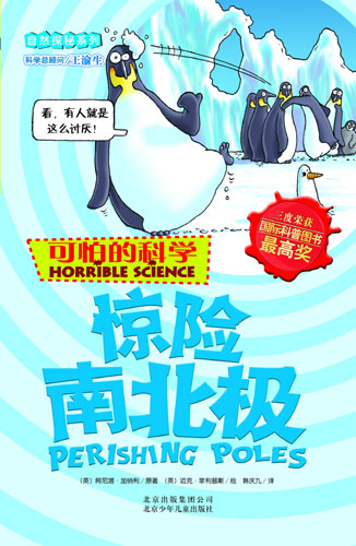 《可怕的科學·驚險南北極》封面 | 叫板《十萬個為什么》的洋科普《可怕的科學》引進版書籍在中國出版,與中式科普讀物問答式的灌輸結構和教科書風格反差很大,傳統科普讀物面臨強烈的挑戰。 在四、五年前,幾乎還是《十萬個為什么》一統天下的局面,好幾代人都是看著《十萬個為什么》長大的。但《可怕的科學》在一年內暢銷3百萬冊,在多元科普知識資訊的時代,顯示了它的競爭力。 在今年的上海書展上,各種各樣紛繁復雜的科普圖書就是一個明證。僅在以中國紅為主基調的一個展區,就集中陳列了14家出版單位的16000余種科普圖書。 眾多科普圖書的風起云涌,出現了一股科普讀書熱。隨著人們的生活越來越講究科學,少兒科普在整個少兒圖書市場所占份額越來越大,并使少兒科普市場逐漸成熟。不過,在那些科普圖書中,數量是上來了,質量卻沒有提高。在那些科普圖書中,引進版多,本地科普少;跟風拼湊的多,原創佳作少。 《可怕的科學》曾三獲世界科普圖書最高獎――安萬特獎。這次北京出版集團公司首先推出的是“經典科學”和“自然探秘”系列。“經典科學”總共20種,涉及到物理學、化學、生物學等學科,采用了《能量怪物》、《觸電驚魂》、《時間揭秘》、《聲音的魔力》等可愛卻瘋狂的名字。 中國科普研究所高士其基金會秘書長高志其先生說,家父高士其先生畢生都為繁榮我國的科普創作而不懈努力著。從這套系列讀物中,你能知道,植物也是有感覺的;數學不再是毫無感情的冷血;鯊魚和細菌,都可能讓這個世界既有的運行模式發生改變;有一些看似淺顯的技能,學會了,可以受用一生。