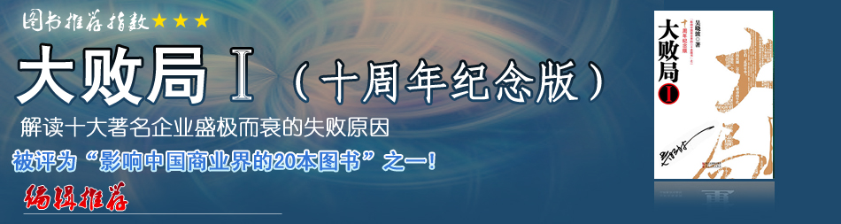 | 《〈大敗局Ⅰ〉十周年套裝紀念版》解讀了十大著名企業盛極而衰的失敗原因:標王失敗的原因是什么?數十億資產的企業為何這般脆弱?“青年近衛軍”為何如此短命?狂熱的激情是怎樣成為禍根的?中國“第一品牌”是怎樣砸掉的?中國網絡經濟的原罪是什么?暴利到底給企業留下了什么?“多元化”的陷阱有多深?企業家離政治該有多近?是一本放在手上令人發燙的書! |