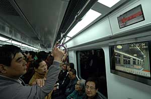 | 10月7日,北京地鐵5號線下午2:00正式售票開通試運(yùn)營,軌道交通全路網(wǎng)票價(jià)2元.北京市民可以乘坐地鐵直接從城南豐臺區(qū)的宋家莊到達(dá)城北昌平區(qū)的天通苑。圖為乘客正在看5號線地鐵車?yán)锏娘@示器。新華社記者
