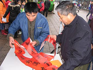| 1月26日,福建省環保志愿者協會和省楹聯學會在福州市五一廣場組織“舊報紙換春聯、環保購物袋”活動。新華社記者 來建強