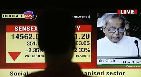 7月6日,在印度東部城市加爾各答,一名股票交易員觀看印度財政部長普拉納布·慕克吉在議會宣布新預算案的電視報道。慕克吉當日在議會宣布了印度新政府成立后的第一個預算案,部分延續了上屆政府的經濟刺激措施,并加大對農業和貧困人口福利等社保收入。 新華社/路透