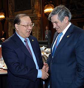 9日,中國財政部長金人慶(左一)出席在德國西部城市埃森舉行的西方七國集團與中國、印度、巴西、南非、俄羅斯、墨西哥財長對話會。新華社記者 吳曉凌