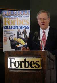 《福布斯》雜志總編輯史蒂夫·福布斯作出判斷:“在我們這個地球上,更多的人經(jīng)濟狀況好于以往……這(2006年)是人類歷史上最為富足的年份。” 《福布斯》雜志編輯說,單純?nèi)《雀缓狸J入排行榜的前20名,“就是一段非同尋常的故事”。 |
