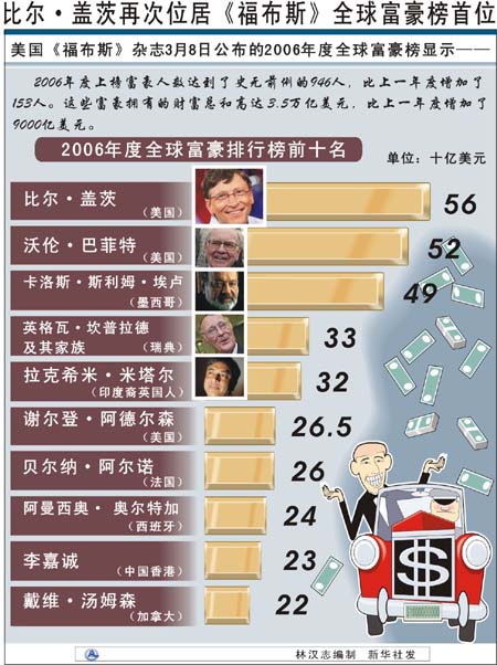 | 美國《福布斯》雜志近日公布2006年度全球個人財富排行榜,羅列了截至2月初個人資產(chǎn)市值達到或超過10億美元的946人。 按照排行榜制作者的說法,《福布斯》排行榜不只是個人財富的簡單羅列,同時也是全球經(jīng)濟及其變化的曲折反映。而近年來亞洲經(jīng)濟的蓬勃向上,也讓財富榜上涌現(xiàn)出越來越多的亞洲富豪。