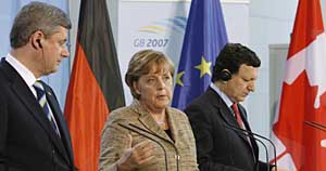 | 4日,德國總理默克爾(中)、加拿大總理哈珀(左)與歐盟委員會主席巴羅佐在德國柏林出席聯合記者招待會。新華社/法新 | 八國集團首腦會議于6日在德國北部海濱小城海利根達姆召開。與會領導人將討論氣候變化、能源安全、投資自由化、知識產權保護及非洲發展等一系列全球問題,并將與包括中國在內的發展中大國領導人舉行對話。 會議東道主、八國集團今年的主席國德國希望本屆峰會在環保和社會責任等方面能夠制定出新的“游戲規則”,搭建未來全球化發展的框架。然而,在當今各國利益相互融合又激烈競爭的背景下,制定兼顧各方利益的新規則談何容易。本屆八國峰會在這方面到底能取得多大成果,格外引人關注。