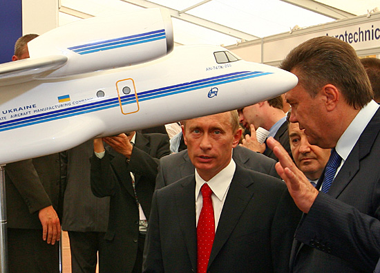 21日,在莫斯科市郊的茹科夫斯基舉行的俄羅斯第八屆國際航空航天展上,烏克蘭總理亞努科維奇(前右)陪同俄羅斯總統普京(前左)參觀烏克蘭生產的飛機的模型。當日,俄羅斯第八屆國際航空航天展在此拉開帷幕。本屆航展共吸引來自39個國家的790家企業參展,參展商以實物樣品、模型、宣傳資料等形式展示了各型現代化飛機、航空武器、防空兵器和太空設備等。