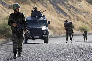 | 17日,幾名土耳其士兵在舍爾納克省巡邏。15日,土耳其政府向議會提交動議,要求議會批準(zhǔn)派安全部隊越境進(jìn)入伊拉克境內(nèi)打擊庫爾德工人黨武裝。新華社/法新 | 近期國際油價接連刷新歷史最高紀(jì)錄,在美國次級抵押貸款危機(jī)已對全球投資者信心造成嚴(yán)重沖擊的大背景下,油價屢創(chuàng)新高及其對全球經(jīng)濟(jì)帶來的挑戰(zhàn)尤其值得關(guān)注。