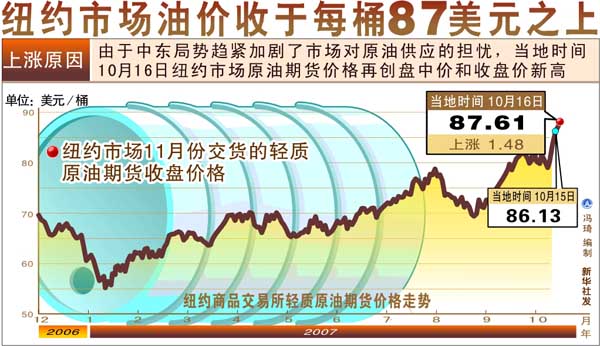 由于中東局勢趨緊加劇了市場對原油供應(yīng)的擔(dān)憂,16日紐約商品交易所11月份交貨的輕質(zhì)原油期貨價格每桶比前一個交易日上漲1.48美元,收于87.61美元,盤中一度觸及88.20美元,分別創(chuàng)下歷史最高收盤價和盤中價。