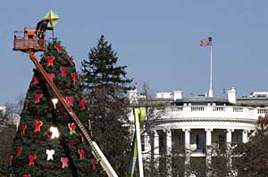 | 28日,在美國首都華盛頓白宮的南草坪,工人將一顆裝飾星放置在國家圣誕樹樹頂。國家圣誕樹的點燈儀式始于1923年,是美國圣誕節的傳統之一,2007年的點燈儀式將于12月6日舉行。新華社記者